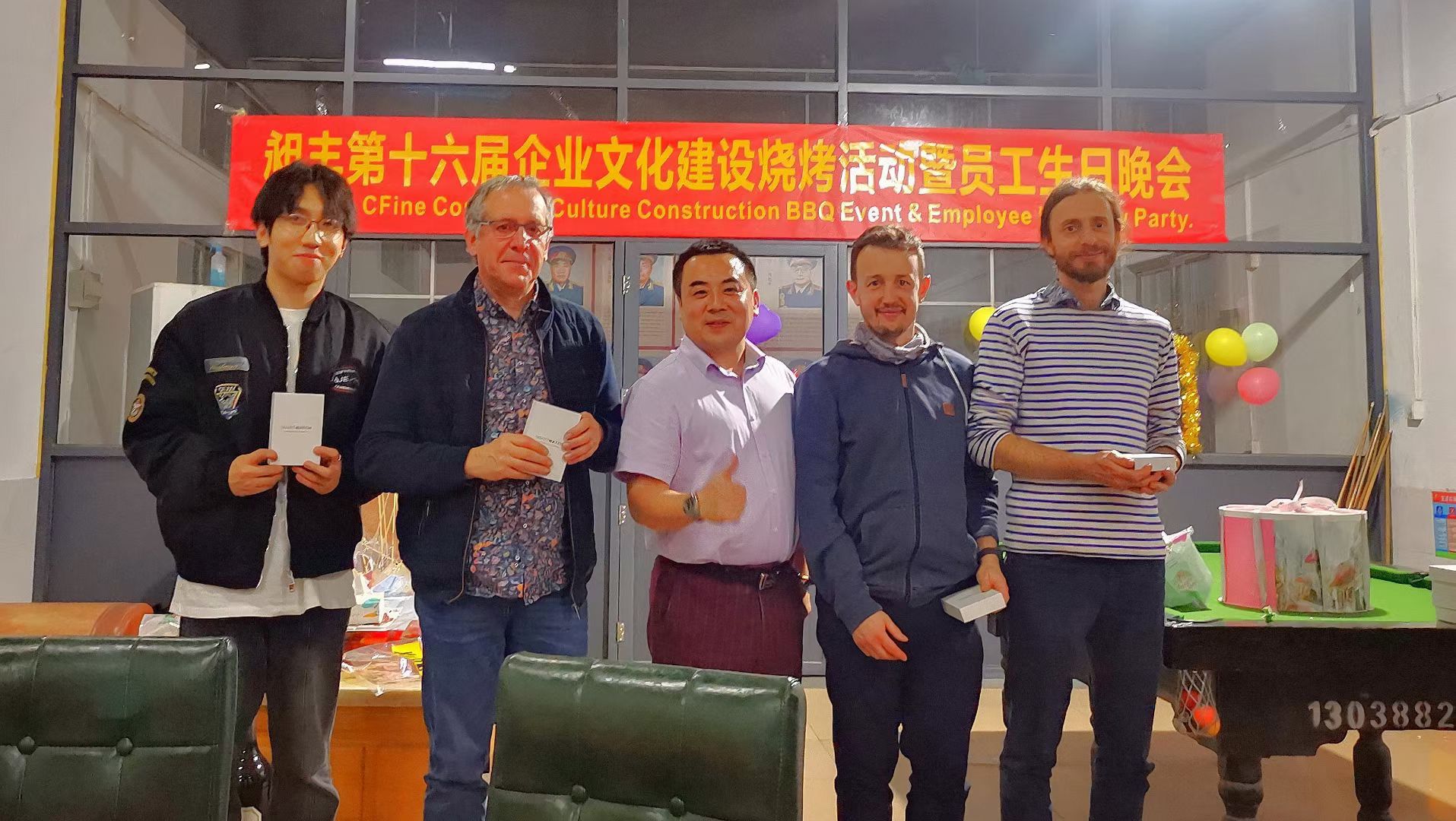 感謝?法國客戶對我們的認可,今天來驗收密煉機,并加入昶豐公司參加員工生日晚會